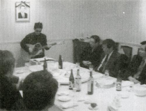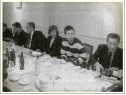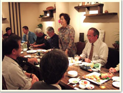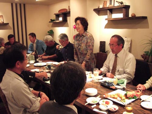 瀬川先生の奥様(新見先生)のご挨拶、新見先生の左横が瀬川先生、その隣に日立製作所北海道支社の山本君(支社長) 右は、尾崎君(北嶺教頭)