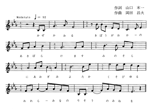 1 風薫る 希望ヶ丘の 朝ぼらけ 真澄の空に 仰ぎ見よ