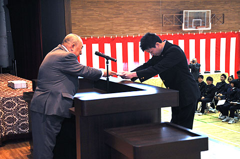 同窓会から表彰される卒業生と記念品の贈呈