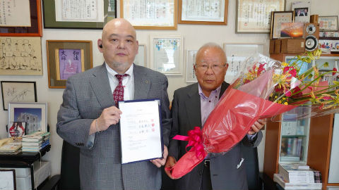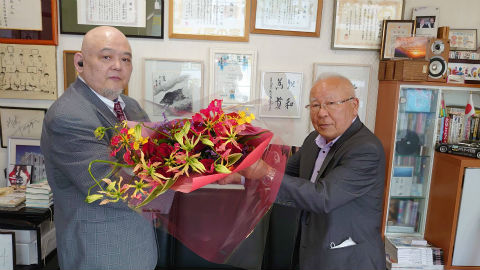 引継書をもつ中森新会長と花束を抱える鍔原前会長